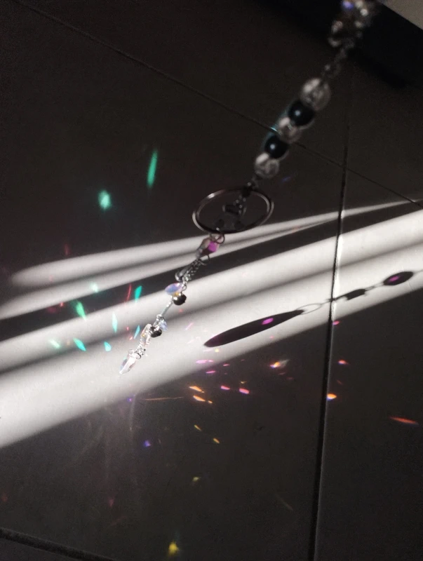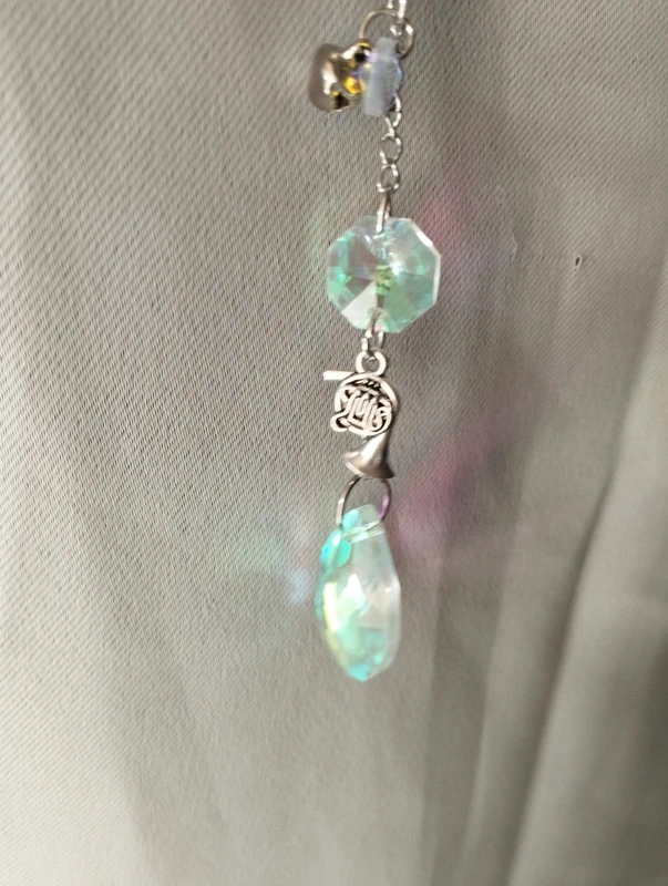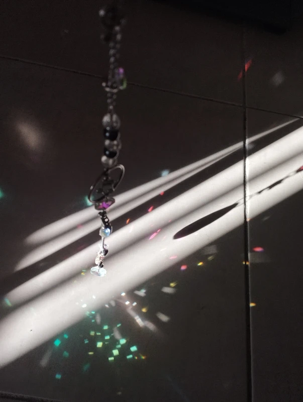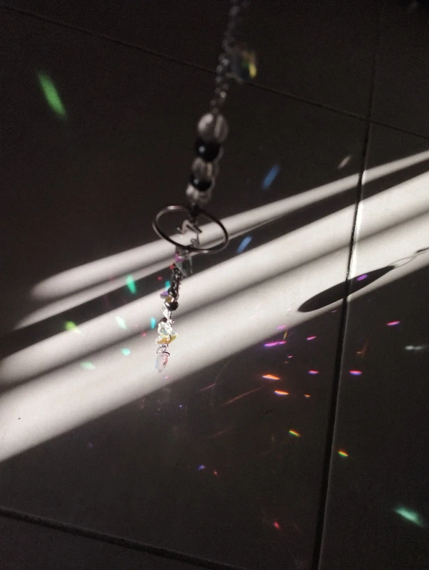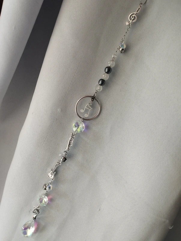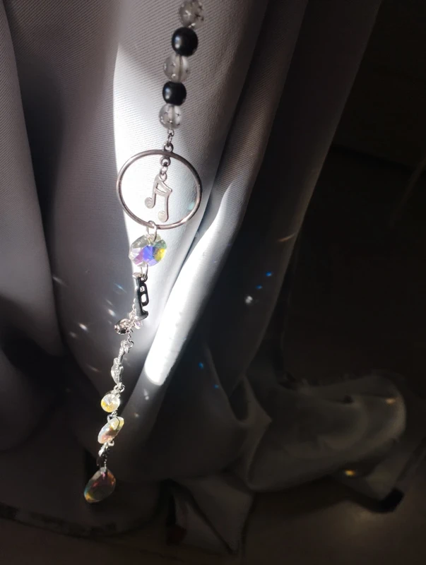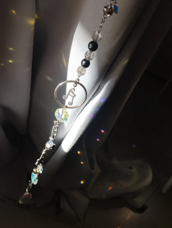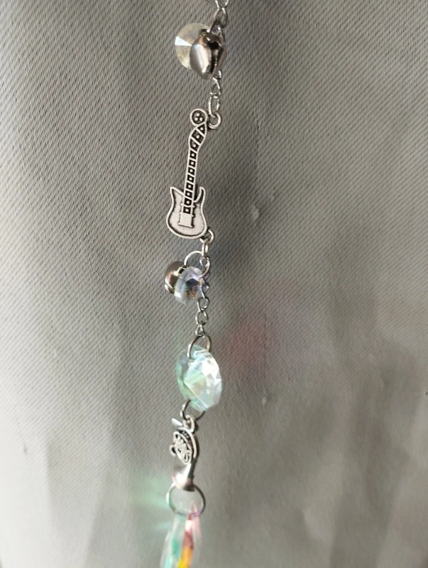 Composé de divers instruments de musique, petites clochettes, notes de musique et pierres réflectives, cet attrape soleil unique embellira votre pièce de jolies couleurs.
