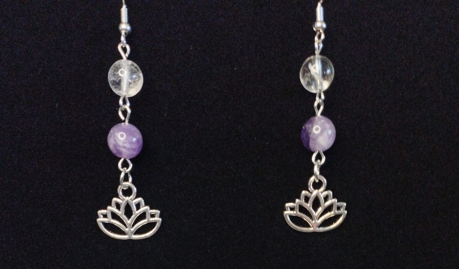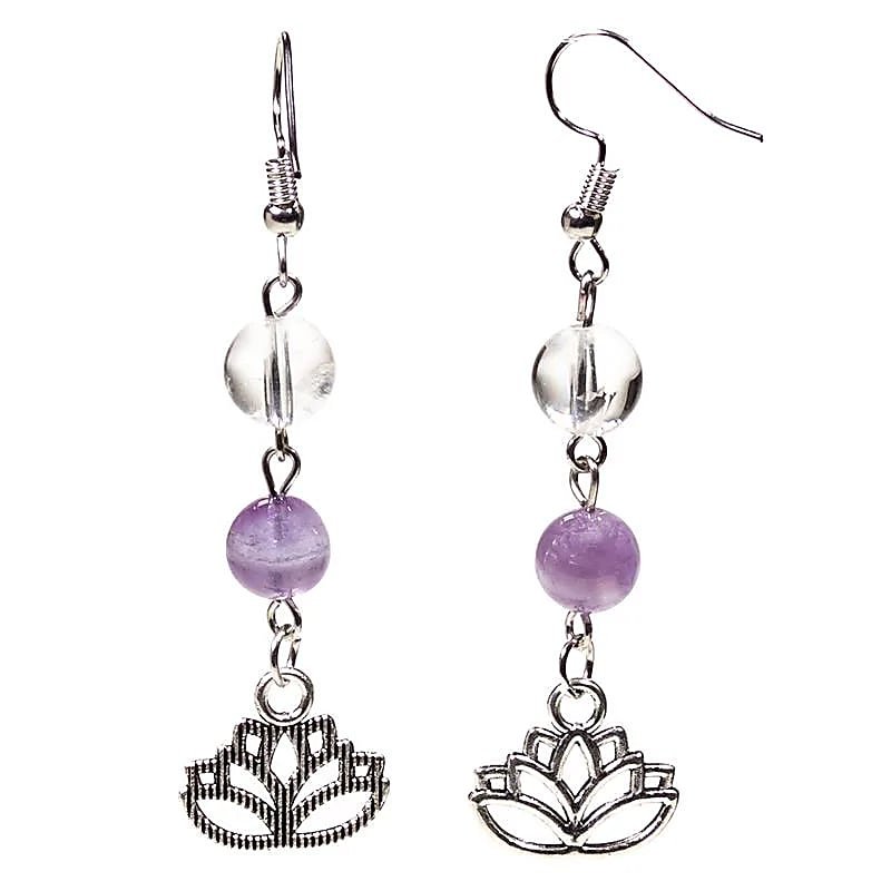 Boucles d’oreilles élégantes en améthyste chevron et cristal de roche 8mm, avec lotus.(Alliage de zinc)